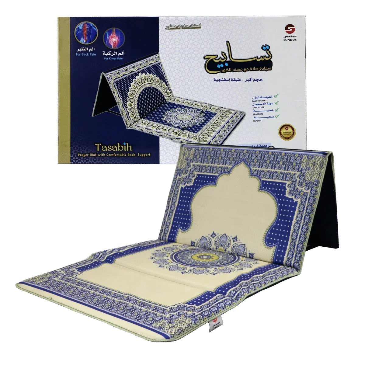 سجادة السندس مع مسند الظهر تمثل نقلة نوعية في عالم سجاد الصلاة. مصممة خصيصاً لتوفير دعماً مثالياً للظهر أثناء الجلوس في التشهد والاستراحة بين الصلوات.